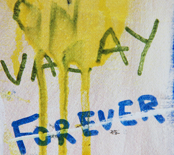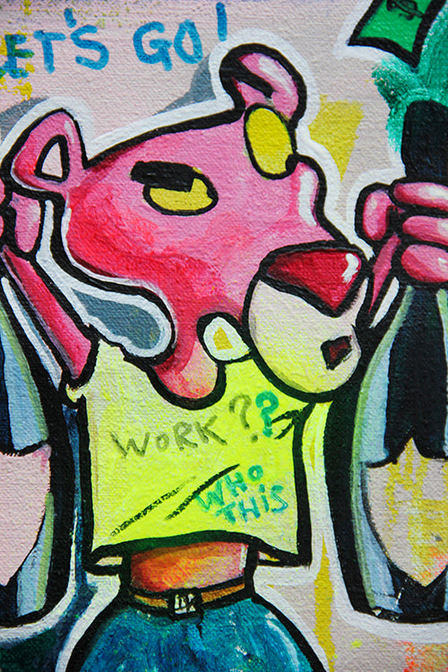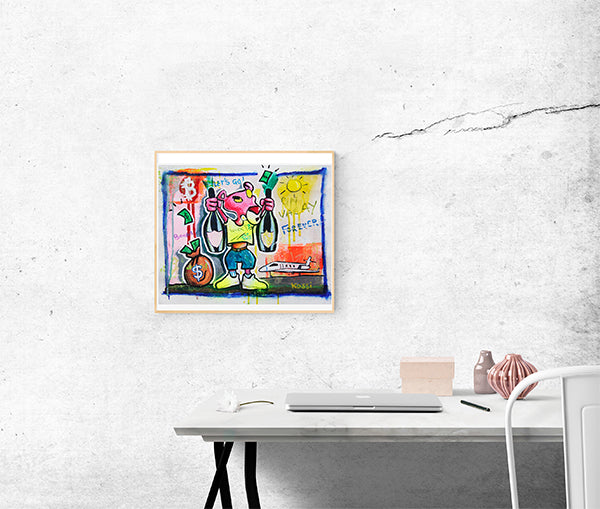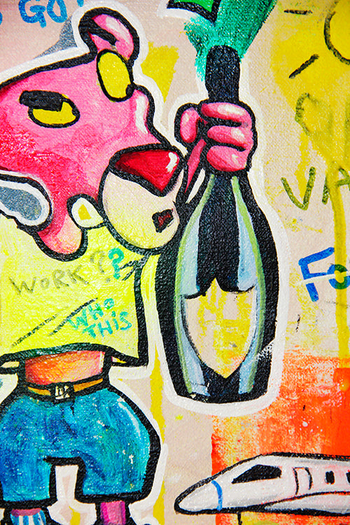 Diese 40 x 33 cm große Leinwand ist Teil meiner neuen Miniserie von Pop-Art-Power-Stücken – kompakt in der Größe, klein im Preis, laut in der Energie. Es ist eine Hommage an verspielten Luxus, Champagnerträume und Cartoon-Ikonen, die zu Lifestyle-Legenden wurden. Eine raffinierte Kombination aus Unfug, Geld und dem Genuss des Lebens.