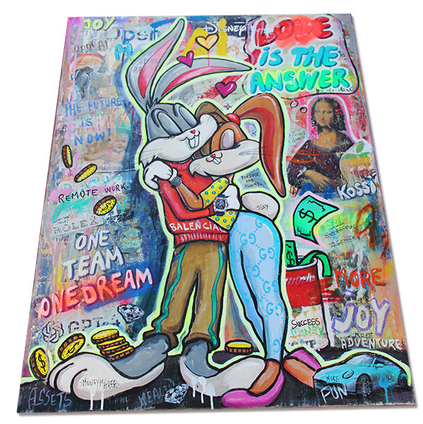 „Love is the Answer“ ist ein fesselndes Pop-Art-Werk, das die beliebten Zeichentrickfiguren Bugs Bunny und Lola Bunny in den Mittelpunkt einer lebendigen, vielseitigen Kulisse stellt. Das Kunstwerk verbindet gekonnt nostalgischen Charme mit zeitgenössischen Themen.