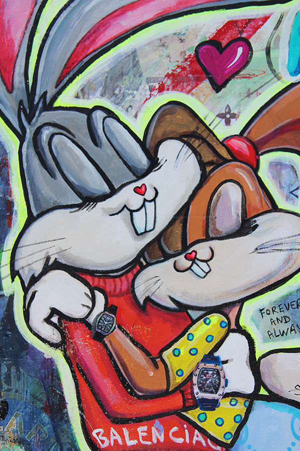 Bugs und Lola Bunny stehen in der Mitte der Leinwand und umarmen sich zärtlich. Bugs, mit seinem charakteristischen grauen Fell und seinem verschmitzten Grinsen, und Lola, mit ihrem goldenen Fell und ihrer selbstbewussten Haltung, sind mit kräftigen schwarzen Linien umrandet, die sie vom farbenfrohen, geschäftigen Hintergrund abheben. Ihre Ausdrücke sind voller Liebe, Frieden und Freude und verkörpern die zentrale Botschaft des Kunstwerks.