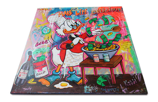 Make Your Life Delicious ist ein kraftvolles und zugleich verspieltes Pop-Art-Statement, das Scrooge McDuck als selbstbewussten Chefkoch zeigt, der ein köstliches „Geldgericht“ zubereitet. Das Kunstwerk verbindet Humor mit Ehrgeiz und verwandelt Reichtum in eine Metapher für Kreativität, bewusste Lebensgestaltung und Selbstverwirklichung. Erfolg entsteht hier nicht zufällig — er wird mit Leidenschaft geplant, gewürzt und genossen.