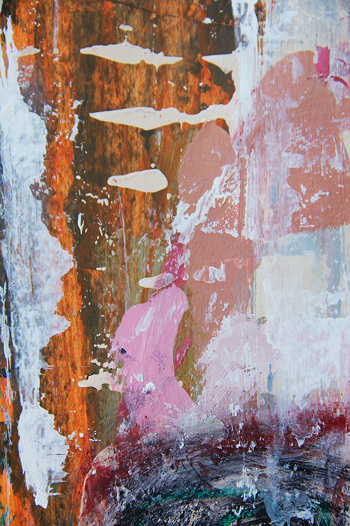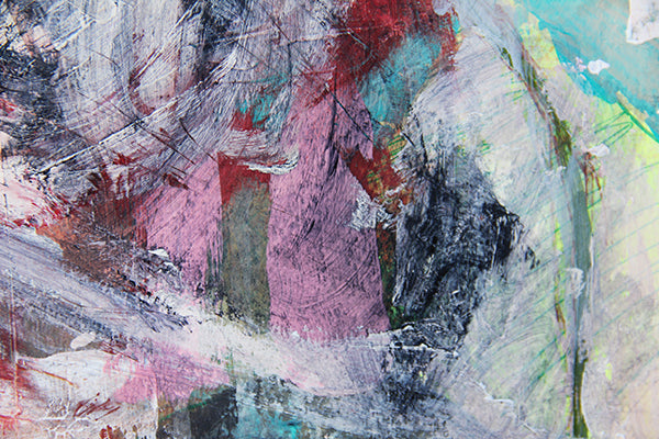 Schichten aus gedämpften Pastelltönen, weichen Graunuancen und erdigen Farbklängen werden aufgebaut und teilweise wieder abgetragen. So entstehen Spuren dessen, was war, und dessen, was sich noch formt. Gestische Pinselstriche, abgeschabte Flächen und transparente Lasuren erzeugen ein Gefühl von Bewegung im Stillstand – als würde das Werk mitten in seiner Verwandlung innehalten.