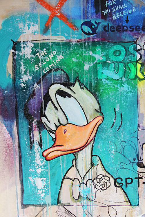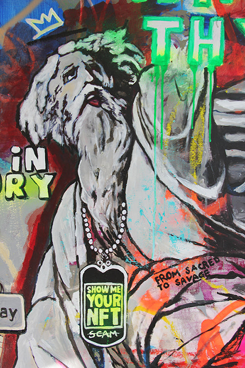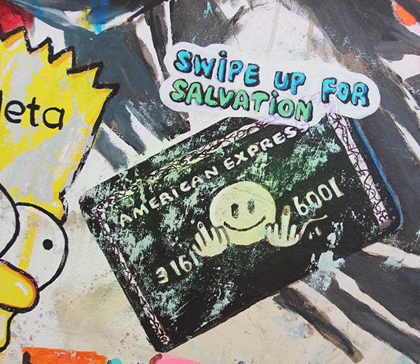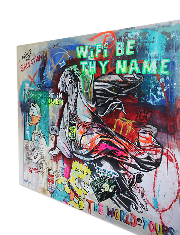 Dieses großformatige Original ist eine mutige und satirische Auseinandersetzung mit modernem Gottesdienst, Identität und digitaler Kultur. Mit lebendigen Mixed-Media-Techniken und typischen Popkultur-Elementen verbindet das Werk klassische Symbolik mit zeitgenössischer Ironie und lädt den Betrachter dazu ein, zu hinterfragen, was wir in einem Zeitalter von Luxus, Technologie und Hypervernetzung wertschätzen.