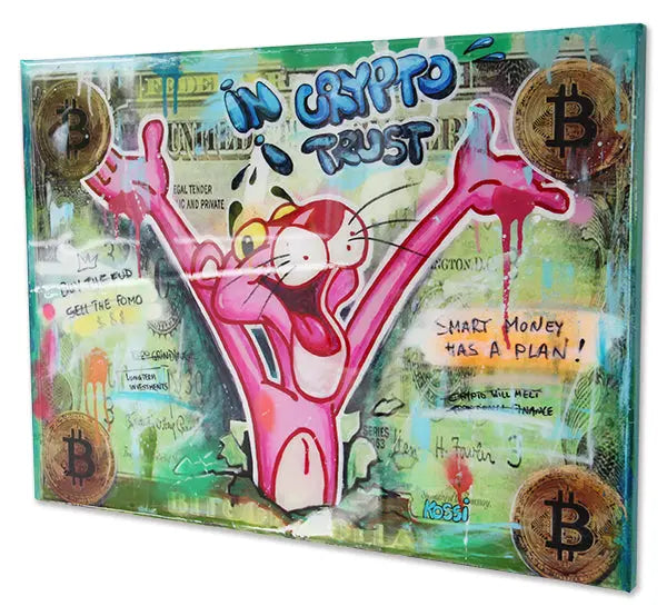 Step into the colorful world of "Crypto Panther," a pop art masterpiece that fuses iconic imagery with modern finance. In this vibrant piece, the Pink Panther takes center stage, boldly depicted with open arms on Bitcoin dollar bill. Above him, the phrase "In crypto I trust", underscoring the piece’s contemporary theme. Kristin Kossi’s signature style breathes life into this work with a dynamic blend of bright colors and striking contrasts, capturing the playful yet assertive spirit of the Pink Panther. This artwork is a stylish commentary on the intersection of classic pop culture and modern cryptocurrency, perfect for adding a touch of bold sophistication to any space.