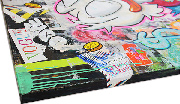 My work lives at the intersection of bold pop culture and personal reflection. Through layered textures, iconic characters, and unexpected juxtapositions, I explore the contradictions of modern life — glamour and grit, success and satire, chaos and clarity. Much of my work reimagines familiar faces — from cartoon legends to luxury icons — not to glorify them, but to question them, twist them, and ultimately make them my own. Characters like Mr. Monopoly, Bugs Bunny, or Homer Simpson become vessels to talk about ambition, abundance, and the absurdity of our times. It’s all pop — but it’s also deeply personal.