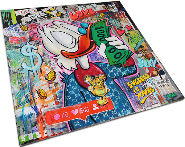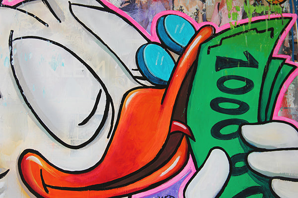 Dive into the vibrant, urban world of "Delicious Money," a pop art creation that captures the audacious spirit of Scrooge McDuck in Kristin Kossi’s dynamic style. In this electrifying piece, Scrooge McDuck is depicted in a bold, graffiti-inspired setting, delightfully licking stacks of million dollar bills. Kossi’s signature urban flair infuses the artwork with vivid colors and energetic textures, bringing to life the iconic character's cheeky relationship with wealth. The raw, rebellious essence of street art meets classic cartoon charm in this playful and provocative portrayal. Perfect for adding a splash of irreverent sophistication to any contemporary space, "Delicious Money" is a daring commentary on opulence and desire.