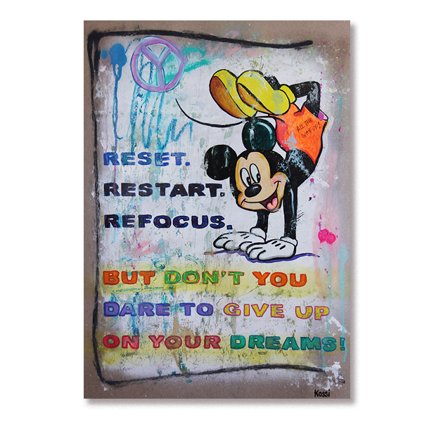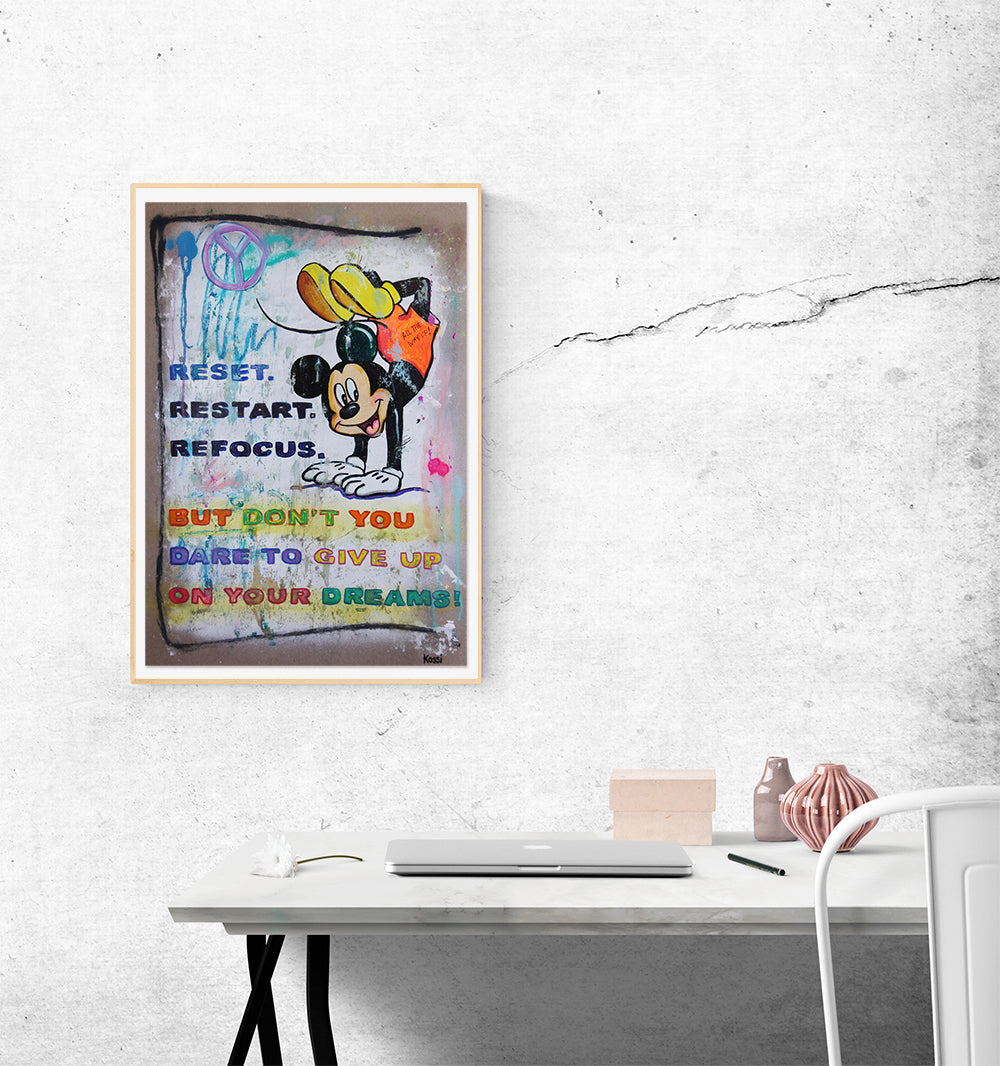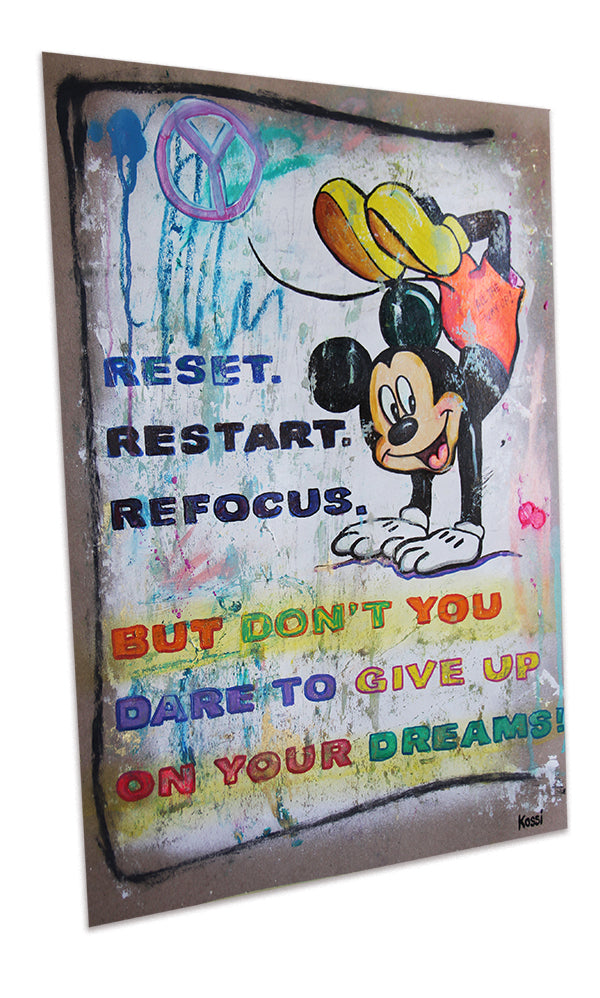 Beside Mickey, a quote in bold, retro lettering reads: "Reset. Restart. Refocus. But don't you dare to give up your dreams!" These words are urging us to embrace change, persevere through challenges, and never lose sight of our aspirations.