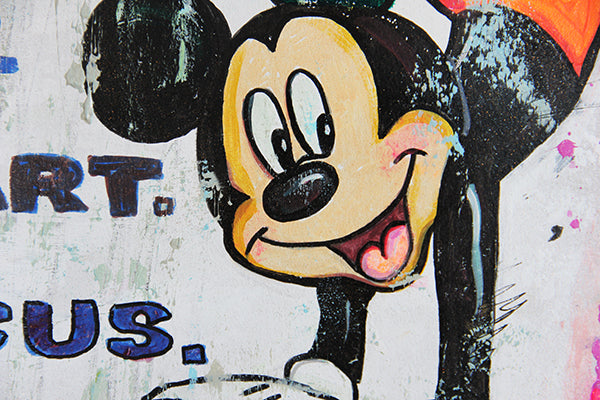 Featuring Mickey Mouse in a playful hand stand, his iconic ears pointing skyward, as if daring the world to see things from a different perspective. The vintage style of the artwork infuses it with a timeless charm, reminiscent of the golden age of animation. Bold colors capture the essence of the pop art movement, giving the piece a lively energy that draws the viewer in.