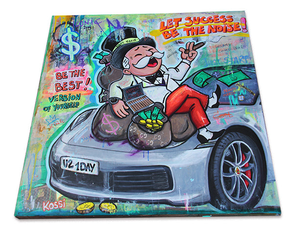 Welcome to the world of Monopoly! This billionaire entrepreneur has a lot to be happy smiling about. From his dream Porsche 911 that he's seated on, to the bags of cash, Monopoly's success is palpable.