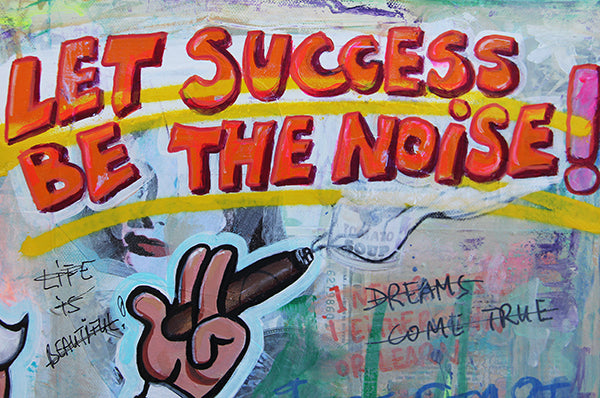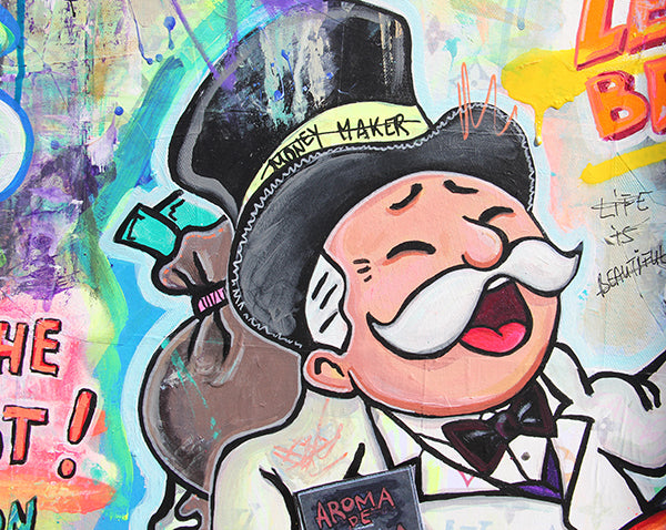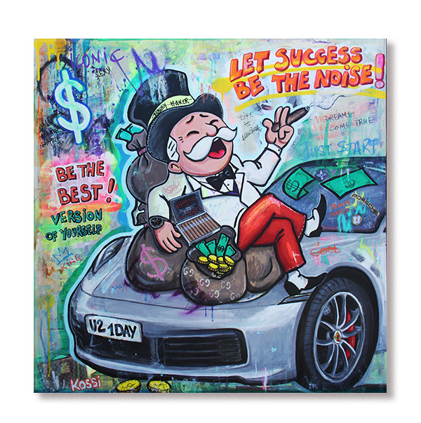 My work lives at the intersection of bold pop culture and personal reflection. Through layered textures, iconic characters, and unexpected juxtapositions, I explore the contradictions of modern life — glamour and grit, success and satire, chaos and clarity. Much of my work reimagines familiar faces — from cartoon legends to luxury icons — not to glorify them, but to question them, twist them, and ultimately make them my own. Characters like Mr. Monopoly, Bugs Bunny, or Homer Simpson become vessels to talk about ambition, abundance, and the absurdity of our times. It’s all pop — but it’s also deeply personal.