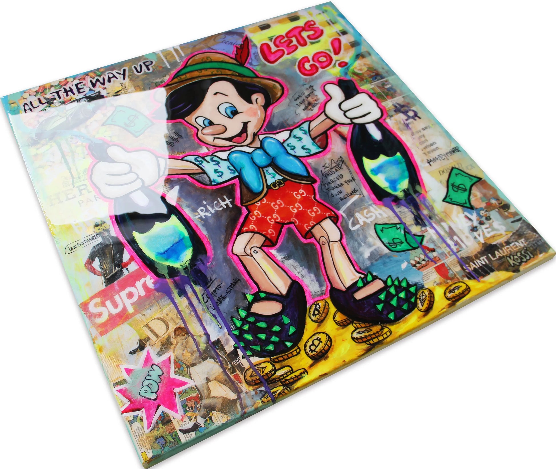Featuring Pinocchio holding Dom Perignon champagne, surrounded by money, crypto coins, and a luxury car, the piece embodies the journey from humble beginnings to living large. With phrases like “All the way up” and “Let’s go!”, this artwork is a bold statement of ambition, transformation, and unapologetic success—perfect for collectors and enthusiasts of luxury pop culture art.