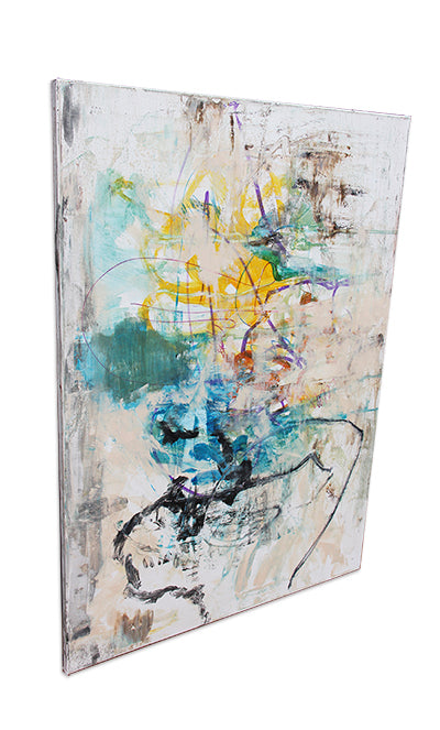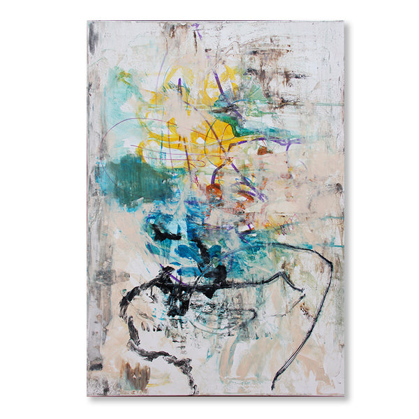 Libertad is an abstract expressionistic painting that explores the emotional journey toward new freedom. The composition balances soft, pale tones with bold contrasting brushstrokes and freely flowing paint — a visual dialogue between calm introspection and the exhilaration of release.