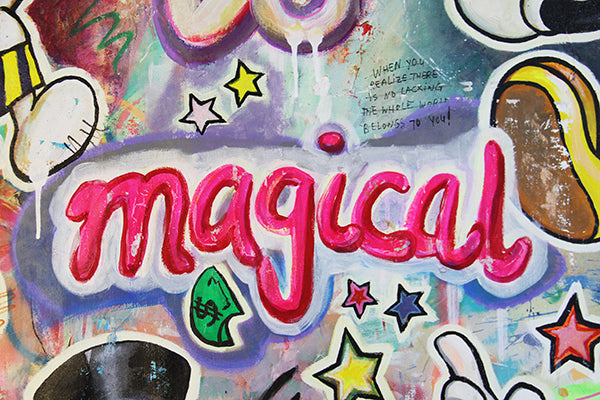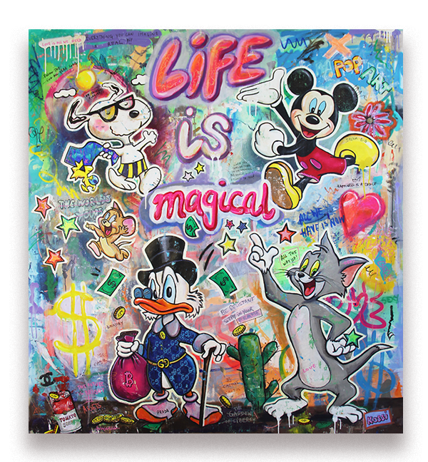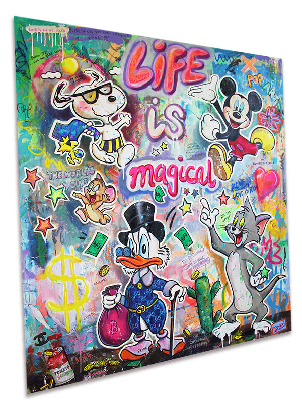 Step into a world of vibrant colors and contagious happiness with the comic pop art masterpiece, "Life is magical". This lively composition features beloved characters - Mickey Mouse, Snoopy, Scrooge McDuck, Tom  and Jerry - coming together to celebrate the magic and beauty of life. This pop art piece is reminding us that amidst the challenges, there is always room for joy and togetherness!