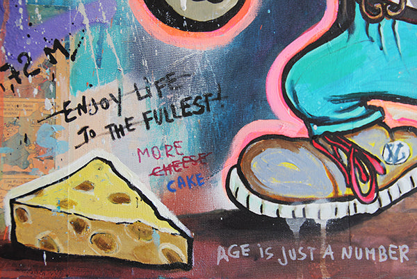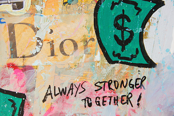 My work lives at the intersection of bold pop culture and personal reflection. Through layered textures, iconic characters, and unexpected juxtapositions, I explore the contradictions of modern life — glamour and grit, success and satire, chaos and clarity. Much of my work reimagines familiar faces — from cartoon legends to luxury icons — not to glorify them, but to question them, twist them, and ultimately make them my own. Characters like Mr. Monopoly, Bugs Bunny, or Homer Simpson become vessels to talk about ambition, abundance, and the absurdity of our times. It’s all pop — but it’s also deeply personal.