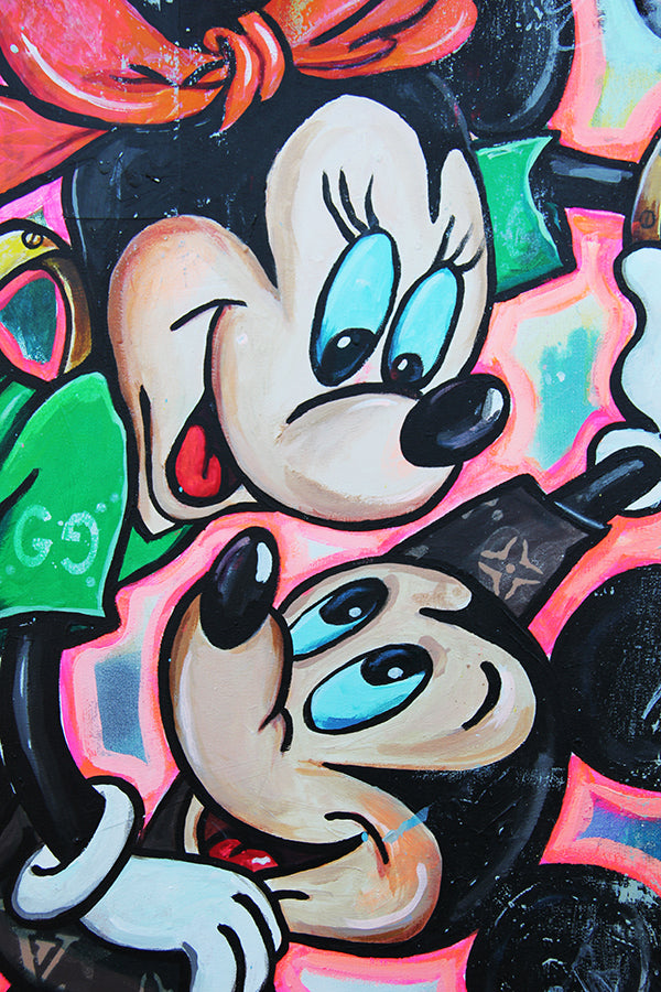 Mickey and Minnie are in full celebration mode — dancing, and living life at its boldest. In this vibrant pop art piece, Mickey tosses Minnie high into the air like pure joy, capturing the energy of a couple who are not just in love, but fully thriving.