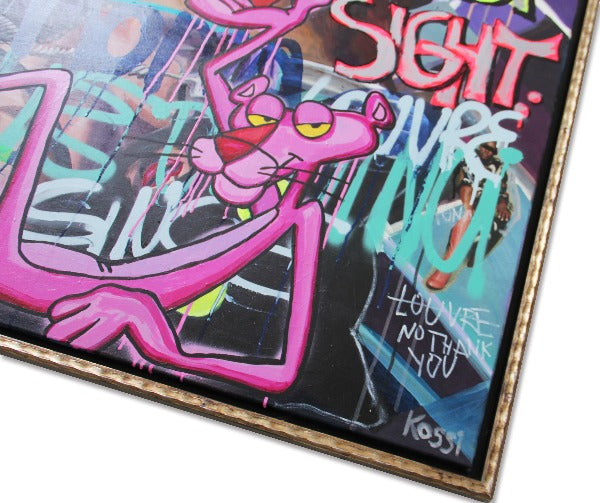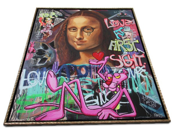 In this artwork, the Mona Lisa is paired with a whimsical, pink lover who is utterly enchanted by her. This unexpected combination adds a layer of humor and modernity to the classic image, creating a playful dialogue between past and present. Pink Panther with his love heart adoration, contrasts sharply with Mona Lisa’s calm and composed demeanor, highlighting the universality and timelessness of love in all its forms.