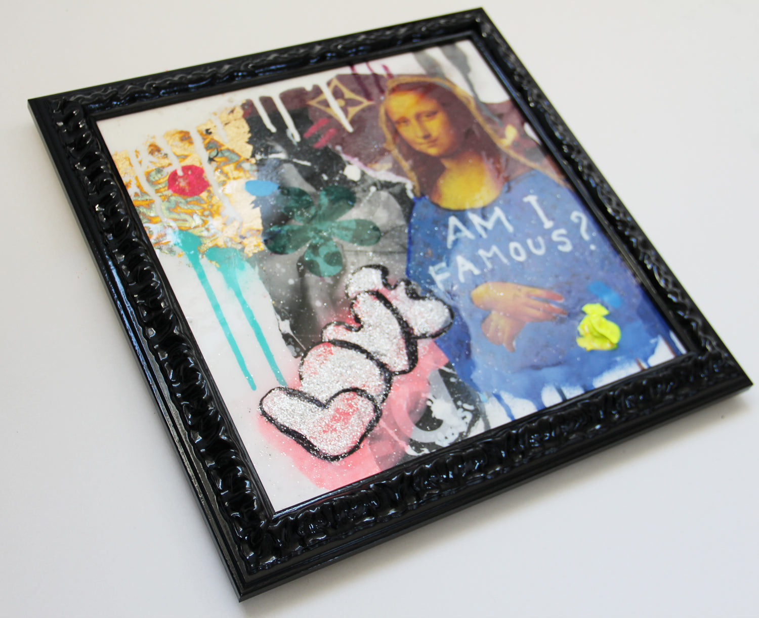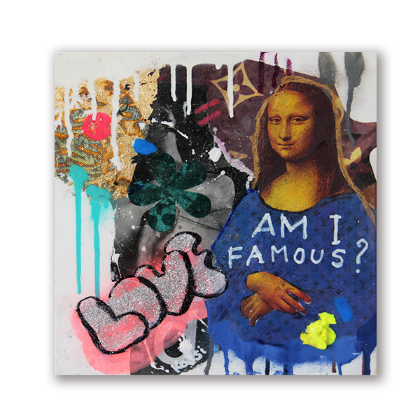 A handwritten quote within the piece asks, “Am I Famous?” — a playful yet thought-provoking question that reflects on fame, identity, and the transformation of icons in today’s culture. Once a timeless symbol of mystery, Mona Lisa now questions her own place in a world ruled by trends and celebrity.