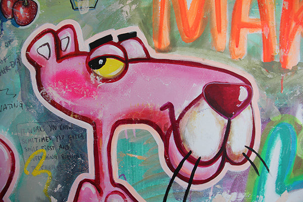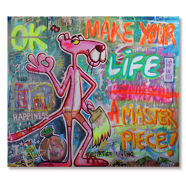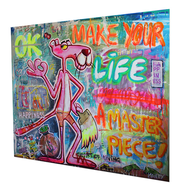 "Make your life a masterpiece" reinforces the notion that each person has the ability to shape their own reality and craft a life that is uniquely their own. These words serve as both an invitation and a challenge to us, urging us to embrace our own creative potential and strive to turn every aspect of our existence into a work of art. This unique piece of art should inspire us to embrace our creativity, follow our passions, and pursue our dreams with determination. Just as Pink Panther wields his paintbrush, so too can we seize the opportunity to become the architects of our own destiny, turning the ordinary into the extraordinary with every brushstroke of life.