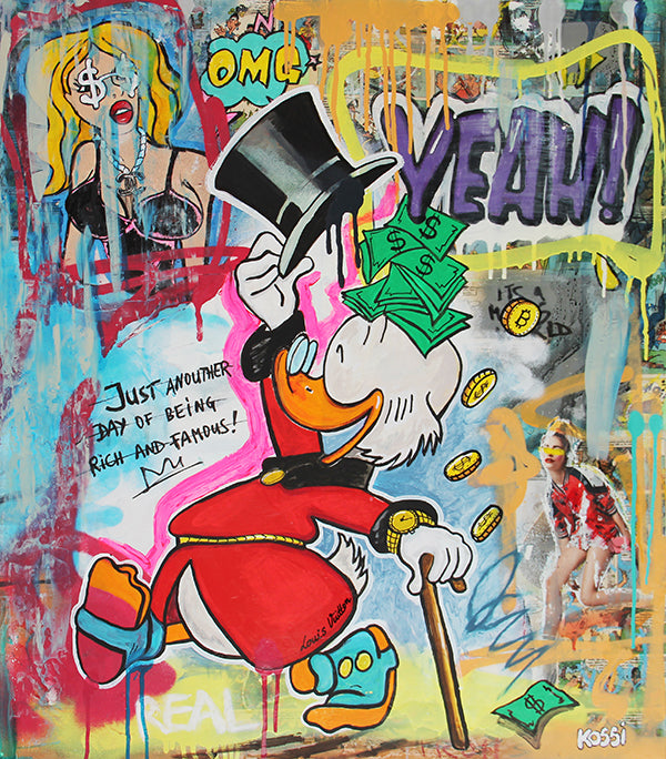 My work lives at the intersection of bold pop culture and personal reflection. Through layered textures, iconic characters, and unexpected juxtapositions, I explore the contradictions of modern life — glamour and grit, success and satire, chaos and clarity. Much of my work reimagines familiar faces — from cartoon legends to luxury icons — not to glorify them, but to question them, twist them, and ultimately make them my own. Characters like Mr. Monopoly, Bugs Bunny, or Homer Simpson become vessels to talk about ambition, abundance, and the absurdity of our times. It’s all pop — but it’s also deeply personal.