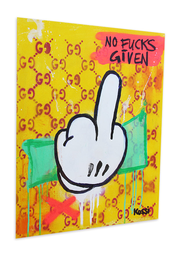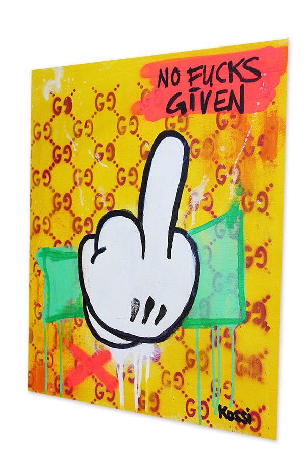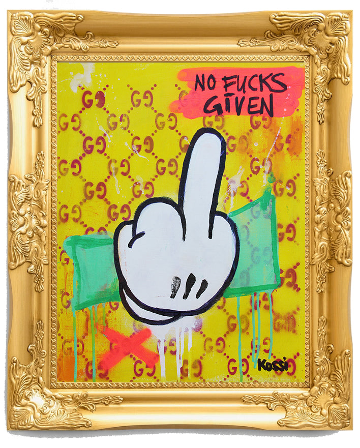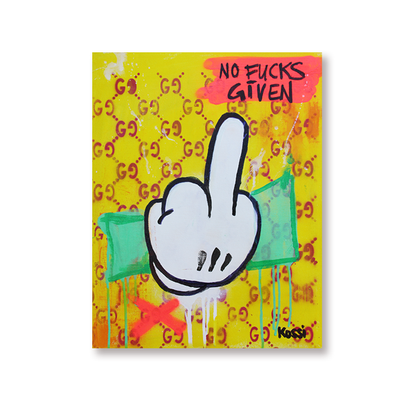 One evening in artist studio, while flipping through a playlist of chaotic inspiration, I glanced at my latest canvas and thought, "What could be more absurd yet perfect than a middle finger?" It’s universal, it’s rebellious, and, honestly, it’s kind of hilarious. But not just any middle finger—a middle finger surrounded by wealth, luxury, and a splash of sarcasm.  I grabbed my paints, letting my instincts take over. The dollar bill became the backdrop, symbolizing the endless chase for money. But that wasn’t enough. No, this needed an "extra". So, I threw in a bright yellow Gucci-inspired background - a cheeky nod to the way luxury brands influence culture.