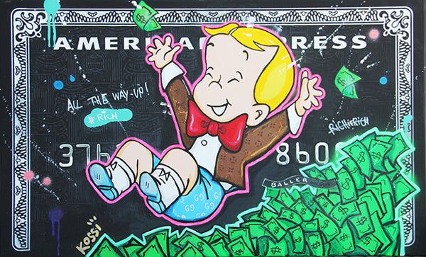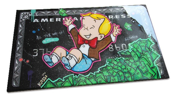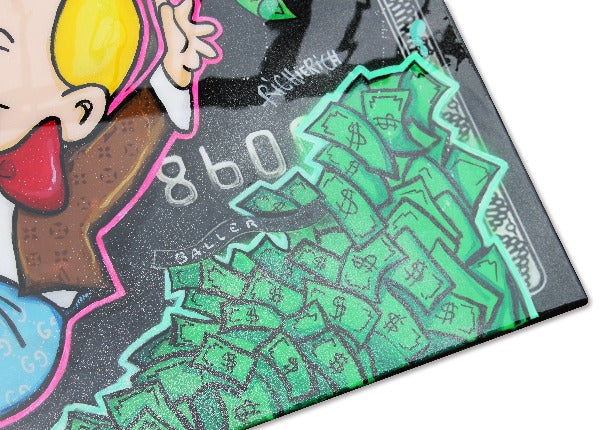 My work lives at the intersection of bold pop culture and personal reflection. Through layered textures, iconic characters, and unexpected juxtapositions, I explore the contradictions of modern life — glamour and grit, success and satire, chaos and clarity. Much of my work reimagines familiar faces — from cartoon legends to luxury icons — not to glorify them, but to question them, twist them, and ultimately make them my own. Characters like Mr. Monopoly, Bugs Bunny, or Homer Simpson become vessels to talk about ambition, abundance, and the absurdity of our times. It’s all pop — but it’s also deeply personal.