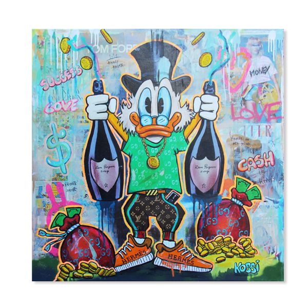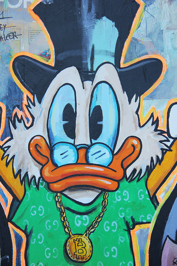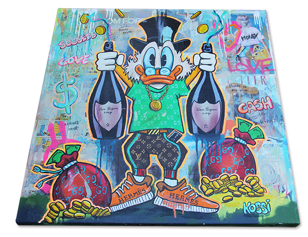 "Scrooge McDuck Champagne and Cash" is a fun, eye-catching pop art piece that screams success. It's a reminder to enjoy the ride and celebrate the wins, big or small. This artwork is all about living life to the fullest, making it a bold and exciting addition to any art collection.