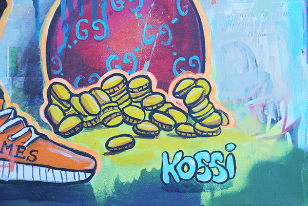 My work lives at the intersection of bold pop culture and personal reflection. Through layered textures, iconic characters, and unexpected juxtapositions, I explore the contradictions of modern life — glamour and grit, success and satire, chaos and clarity. Much of my work reimagines familiar faces — from cartoon legends to luxury icons — not to glorify them, but to question them, twist them, and ultimately make them my own. Characters like Mr. Monopoly, Bugs Bunny, or Homer Simpson become vessels to talk about ambition, abundance, and the absurdity of our times. It’s all pop — but it’s also deeply personal.