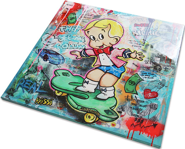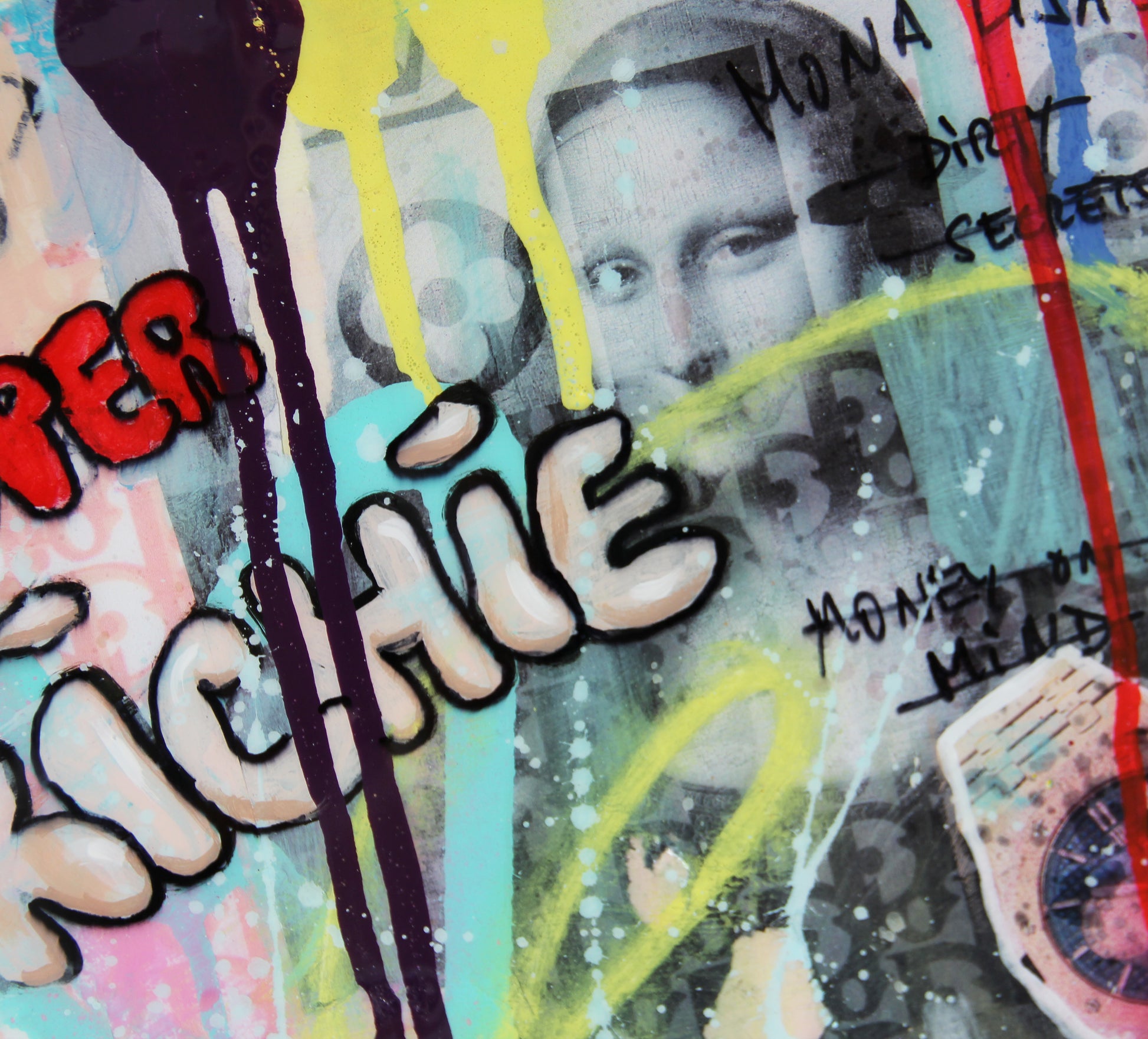 My work lives at the intersection of bold pop culture and personal reflection. Through layered textures, iconic characters, and unexpected juxtapositions, I explore the contradictions of modern life — glamour and grit, success and satire, chaos and clarity. Much of my work reimagines familiar faces — from cartoon legends to luxury icons — not to glorify them, but to question them, twist them, and ultimately make them my own. Characters like Mr. Monopoly, Bugs Bunny, or Homer Simpson become vessels to talk about ambition, abundance, and the absurdity of our times. It’s all pop — but it’s also deeply personal.