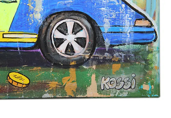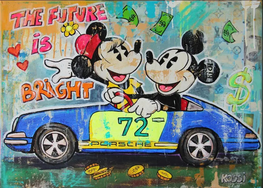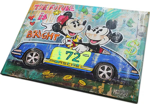Showcasing Mickey and Minnie Mouse driving Porsche into the bright future full of love, happiness and success. Original artwork by artist Kristin Kossi.