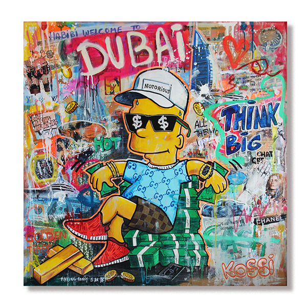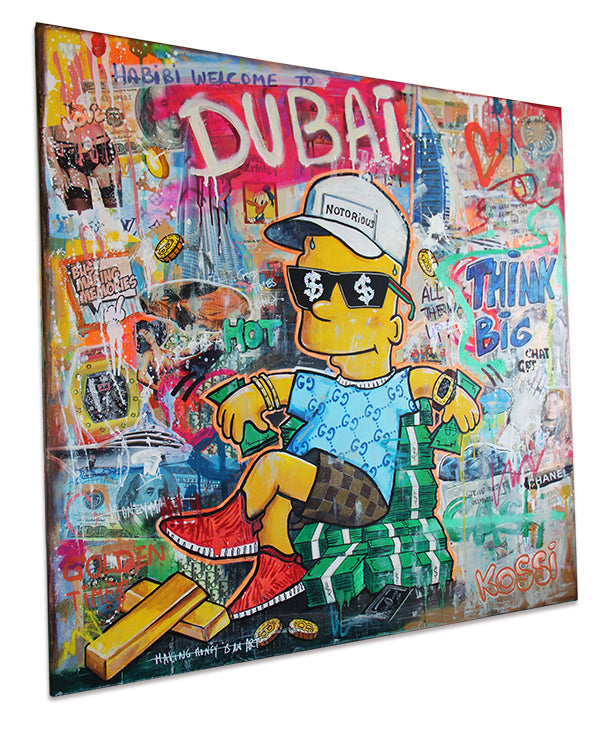 The pop art piece shows Bart Simpson in a laid-back, relaxed pose, sitting on a pile of banknotes. In the background, the iconic buildings of Dubai are visible, with their impressive skyscrapers and futuristic structures, along with luxury cars and yachts, capturing the atmosphere of wealth and progress.