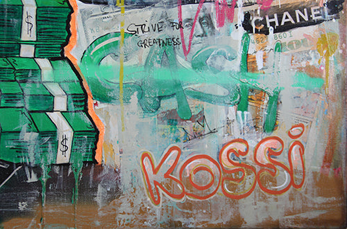 My work lives at the intersection of bold pop culture and personal reflection. Through layered textures, iconic characters, and unexpected juxtapositions, I explore the contradictions of modern life — glamour and grit, success and satire, chaos and clarity. Much of my work reimagines familiar faces — from cartoon legends to luxury icons — not to glorify them, but to question them, twist them, and ultimately make them my own. Characters like Mr. Monopoly, Bugs Bunny, or Homer Simpson become vessels to talk about ambition, abundance, and the absurdity of our times. It’s all pop — but it’s also deeply personal.