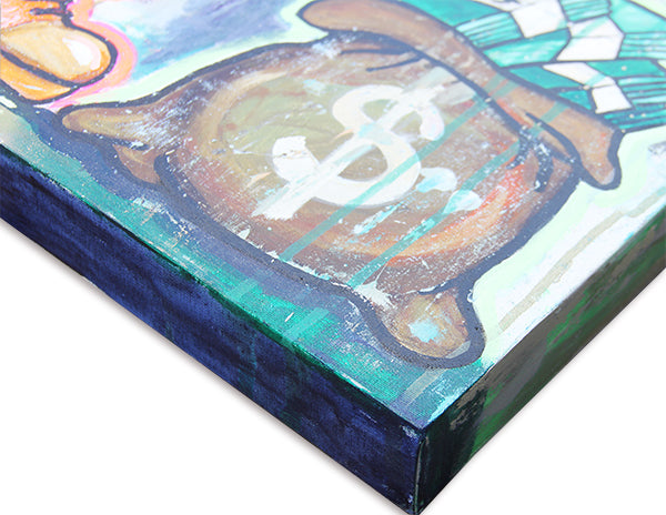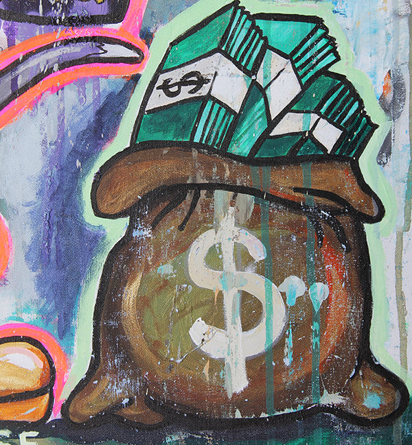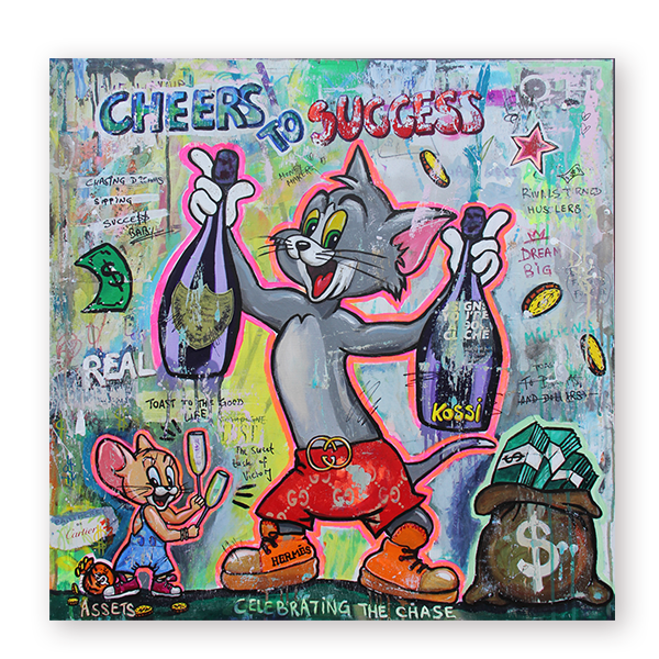 My work lives at the intersection of bold pop culture and personal reflection. Through layered textures, iconic characters, and unexpected juxtapositions, I explore the contradictions of modern life — glamour and grit, success and satire, chaos and clarity. Much of my work reimagines familiar faces — from cartoon legends to luxury icons — not to glorify them, but to question them, twist them, and ultimately make them my own. Characters like Mr. Monopoly, Bugs Bunny, or Homer Simpson become vessels to talk about ambition, abundance, and the absurdity of our times. It’s all pop — but it’s also deeply personal.