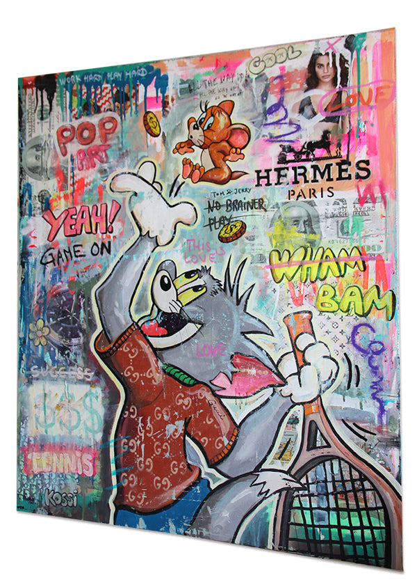 The pop art piece "Tom & Jerry- Lets Play" captures the classic duo in an unexpected and humorous moment on the tennis court. Tom, the mischievous cat, is depicted mid-swing with his tennis racket, about to hit Jerry, the clever mouse, who is hilariously being used as the ball. The vibrant colors and bold lines typical of Kristin Kossi`s pop art add an energetic and playful vibe to the scene.