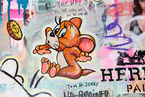 My work lives at the intersection of bold pop culture and personal reflection. Through layered textures, iconic characters, and unexpected juxtapositions, I explore the contradictions of modern life — glamour and grit, success and satire, chaos and clarity. Much of my work reimagines familiar faces — from cartoon legends to luxury icons — not to glorify them, but to question them, twist them, and ultimately make them my own. Characters like Mr. Monopoly, Bugs Bunny, or Homer Simpson become vessels to talk about ambition, abundance, and the absurdity of our times. It’s all pop — but it’s also deeply personal.