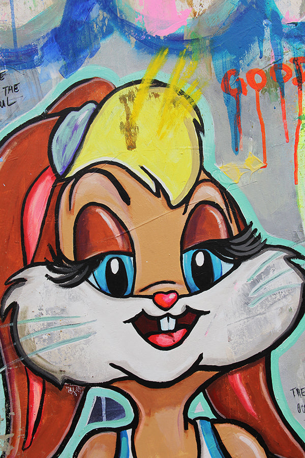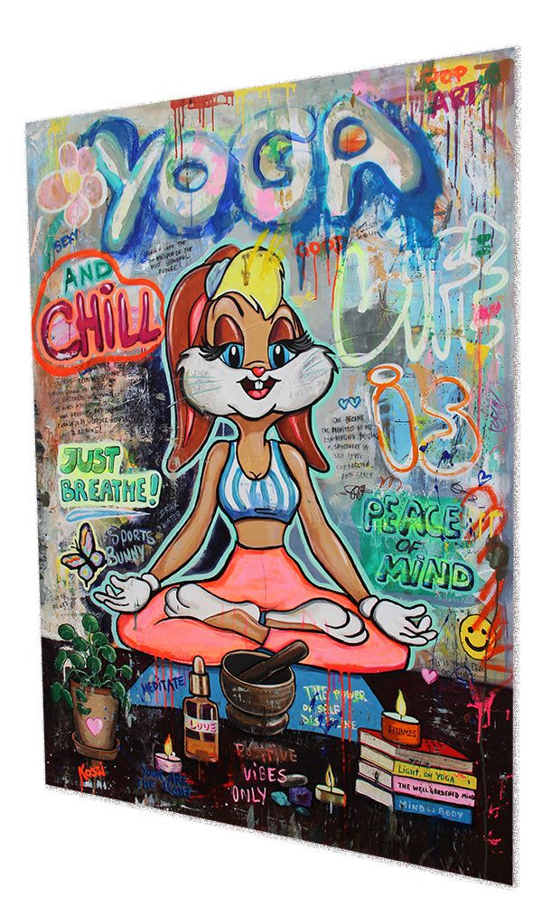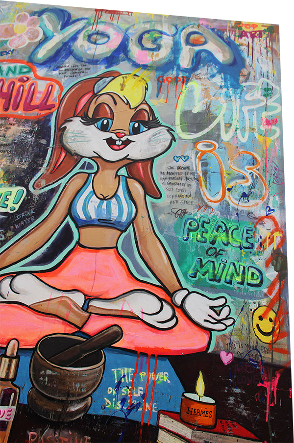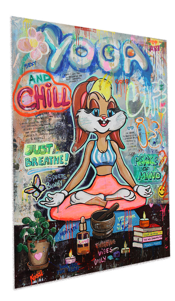Kossi's signature urban graffiti style is brought to life with vibrant colours and dynamic textures, giving this playful yet profound artwork a contemporary edge. The background explodes with energy, perfectly complementing Lola Bunny's calm and centred presence. This piece exudes tranquility and joy, effortlessly blending mindfulness with pop culture charm. It's the ideal addition for both art enthusiasts and those who value mindfulness and well-being. This artwork not only enhances any space with its lively and positive aura but also serves as a daily reminder to find joy and balance in our lives.