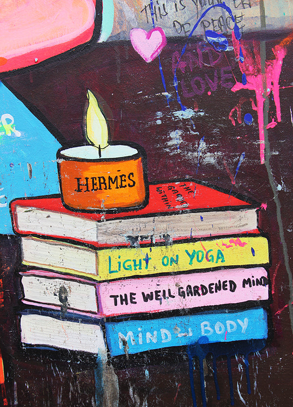 "Yoga Bunny" by Kristin Kossi captures Lola Bunny in a serene yoga meditation pose. Lola sits cross-legged, eyes radiating happiness, gazing confidently into a bright future. Surrounded by a Tibetan singing bowl, candles, crystals, best-seller yoga and well-being books, a plant, and a love elixir, she is ready to take on the world. These elements symbolise the harmony of body, mind and spirit, as well as the pursuit of inner peace and self-love.